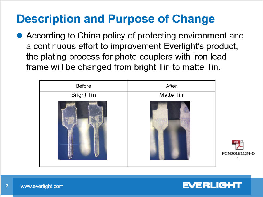 根據中國環境保護政策和億光產品不斷改進的努力,鐵制引線框架光耦的電鍍工藝將由亮錫改為霧錫。( According to China policy of protecting environment and a continuous effort to improvement Everlight’s product, the plating process for photo couplers with iron lead frame will be changed from bright Tin to matte Tin. )